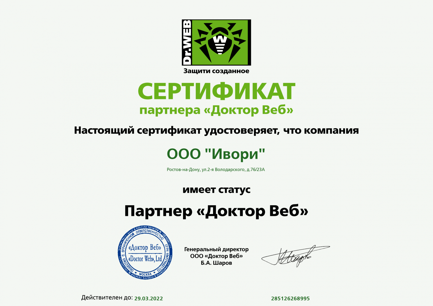Получен сертификат Dr.WEB по лицензированию Dr.Web Security Suite.